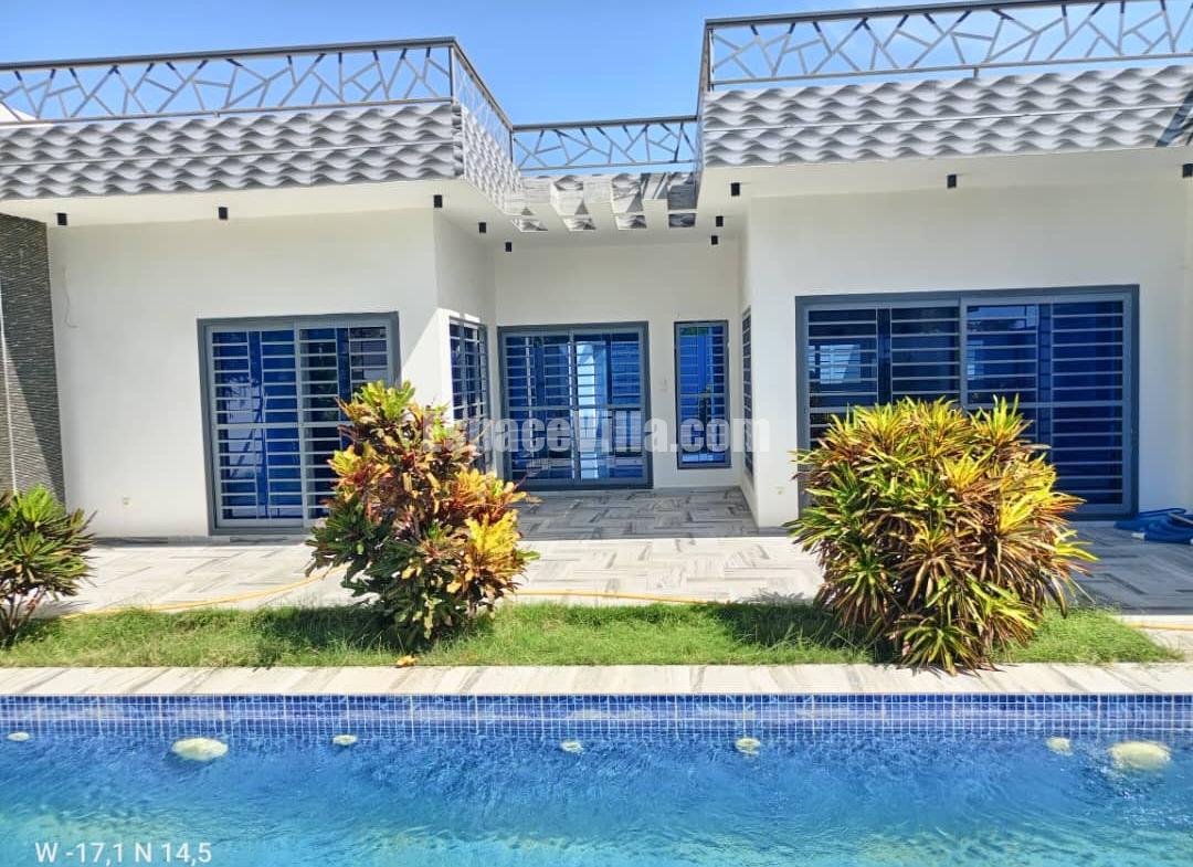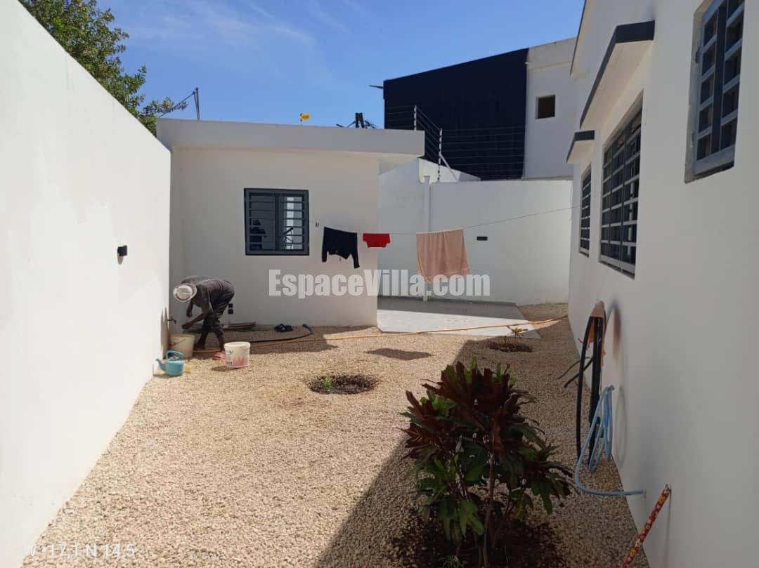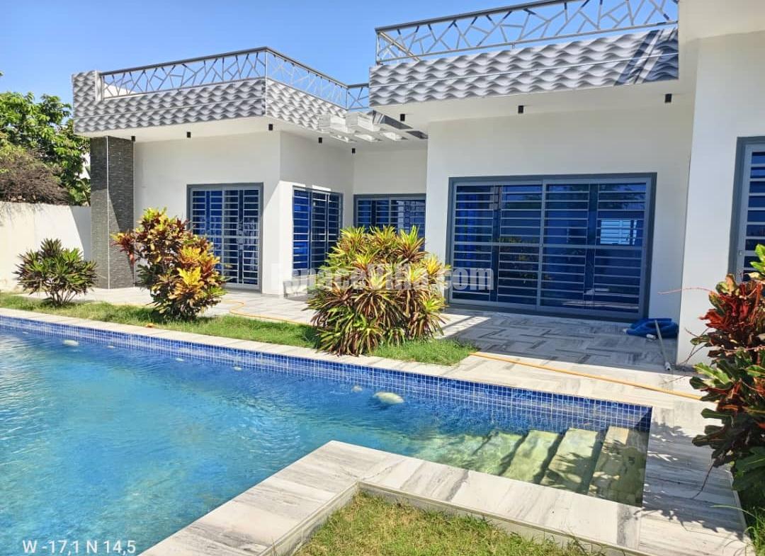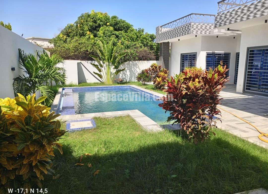 Villa à Vendre à Somone dans un quartier calme. Surface du terrain 500 m2, la villa est composée de 3 chambres avec salles de bains, salon, cuisine, piscine, jardin très espacieux,
