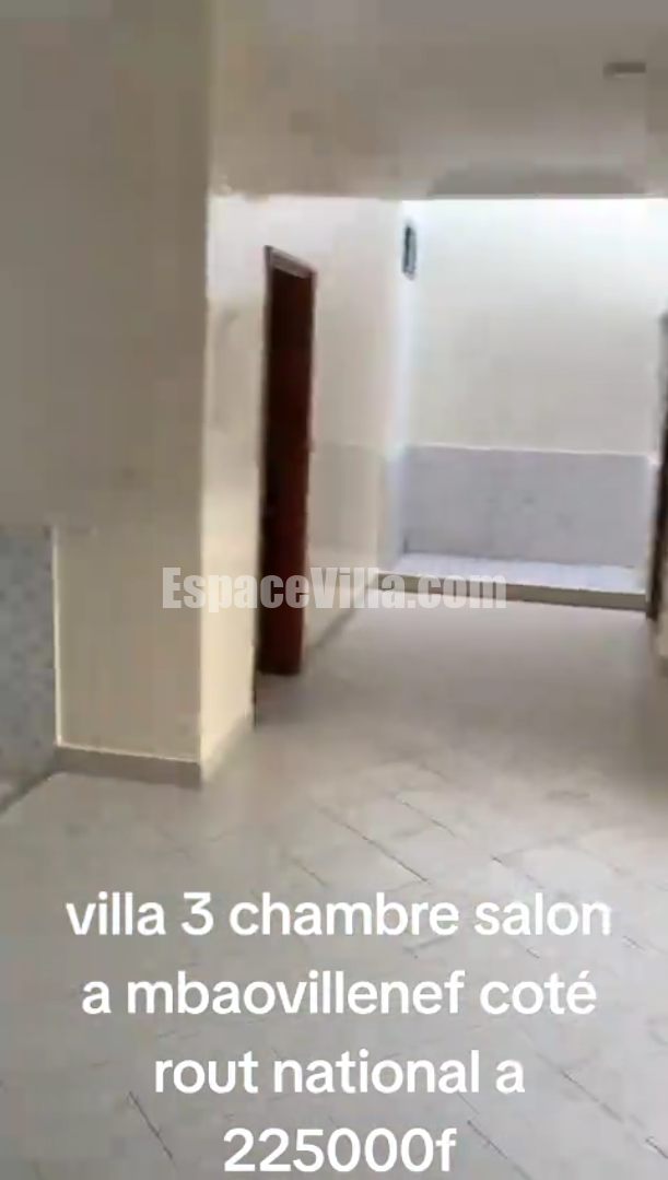 Villa F4 à louer à Mbao ville-neuve coté route nationale. Villa composée de 3 chambre, Salon, Salles de bains, Cuisine. Prix loyer: 225milles Fcfa /mois Avec le Garage 250milles Fcfa/mois